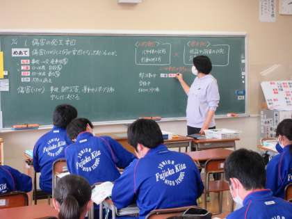4月21日(木) 2年生保健体育の授業 公開日 2022/04/21 更新日 2022/04/21 できごと たくさんの生徒が積極的に挙手、発言し、生徒の活躍がたくさん見られた授業でした。2年生の保健体育の授業では傷害の要因について学び、身近なけがの要因について考えていました。先生のテンポのよい発問に、生徒は意欲的に答え、黒板にはネームプレートがどんどん貼られていく多くの生徒が活躍しました。