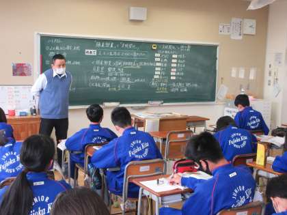 4月21日(木) 3年生社会の授業 公開日 2022/04/21 更新日 2022/04/21 できごと 3年生の社会では「殖産興業」と「文明開化」によって人々の生活がどう変わっていったのかについて考えました。 黒板にはたくさんのネームプレートが貼られ、生徒の意見を大切にしながら授業が進められていました。