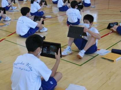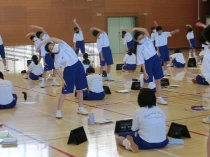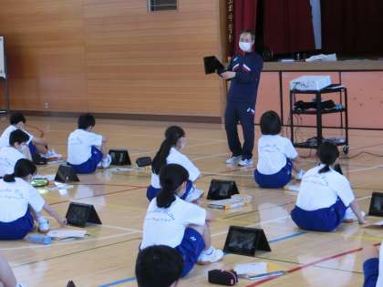 ラジオ体操の学習です。小学校ではiPadを使っていた1年生。Chromebookを使った動画撮影の方法を確認した後、友達同士で実際に体操をする様子を撮影し合い、よりよい動きになるよう改善する点を見つけていました。