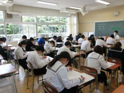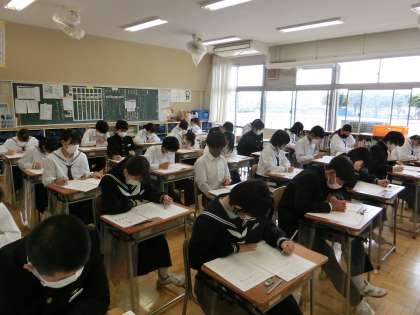 3年生の実力テストが行われています。昨日に続き、本日は二日目。集中した雰囲気の中、進路選択に向けて一歩一歩、真剣に取り組む3年生です。
