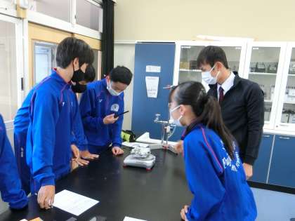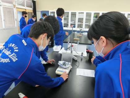 化学変化についての学習です。スチールウールを燃焼させる(酸化させる)と、質量(重さ)の変化はあるのか。予想を立て、実験をしました。目の前できれいに燃焼するスチールウールを観察し、はかりを見ると「増えている!」。驚きと納得の声が上がっていました。