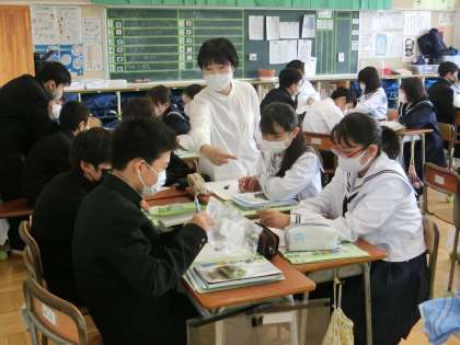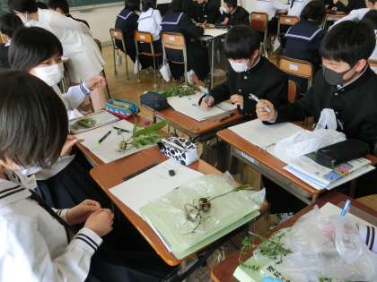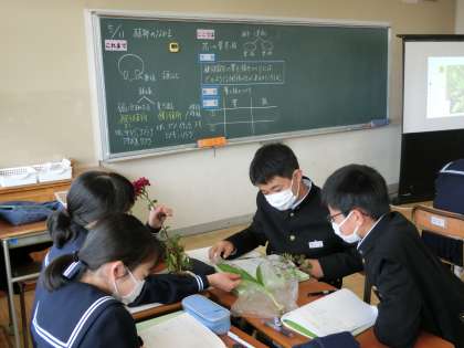 5月11日(水) 1年生理科の授業 公開日 2022/05/11 更新日 2022/05/11 できごと 植物の種類についての学習です。机の上には、生徒が自宅から持ってきた様々な植物が並んでいます。葉と根に着目して観察し、種類分けをしました。これまで学習した花についての比較の視点を参考に、自分の考えをもち、友達と意見交流をしていました。