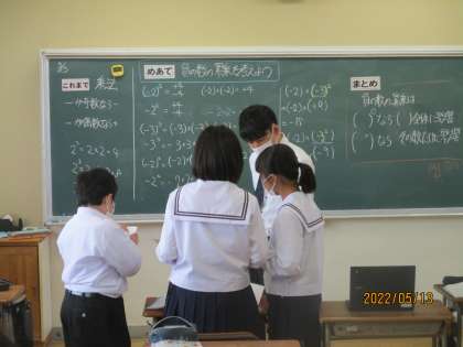 今日は、負の数の累乗について学んでいました。教室にうかがったときには、今日の授業のまとめが終わり問題にチャレンジして、その答えを近くの子と共有し合っているところでした。マイナスがついていたり、カッコがあったり、カッコの中の数字に累乗がついていたり、カッコの外に累乗がついていたり、生徒は注意深く確かめながら答え合わせを進めていました。「分かっているけど、ついうっかり間違ってしまう」まずはじっくり丁寧に進めてください。