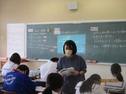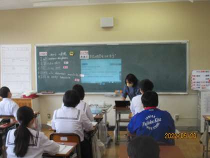 5月20日(金) 2年生英語の授業 公開日 2022/05/20 更新日 2022/05/20 できごと 2年生英語の授業の様子です。 「 I will 〜 」 これからを表す表現を使った本文の内容を学習しました。 デジタル教科書の音声に合わせて、「Reading」。
