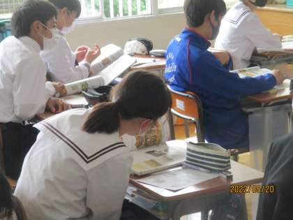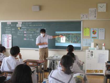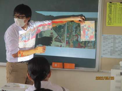5月20日(金) 2年生社会科の授業 公開日 2022/05/20 更新日 2022/05/20 できごと 2年生社会科の授業の様子です。 「信長と秀吉の時代の文化にはどんな特徴があったのだろう」 今日は、 安土桃山時代の文化について考えました。 狩野永徳・山楽の絵画。 千利休による茶の湯「茶道」の文化。 浄瑠璃や、歌舞伎のもととなる歌舞伎踊りが流行しました。 資料集にある当時の歌舞伎が描かれた資料を見ながら、周りにいる観衆の様子から当時の庶民の様子を想像していました。