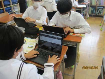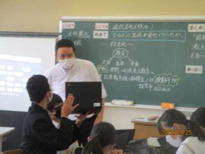 5月25日(水) 3年生社会科の授業 公開日 2022/05/25 更新日 2022/05/25 できごと 3年生社会科の授業の様子です。 「どのように生活が変化してきたのだろうか?」近代文化についてまとめました。 授業の最後には、いままでの学習のまとめとして、近代文化にかかwるクイズの問題を作成し、1人1台端末オクリンク機能を使って、みんなで共有していました。
