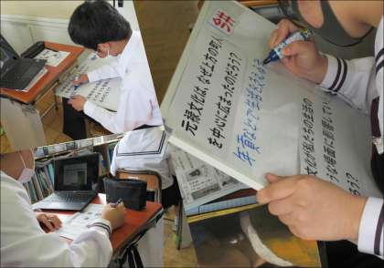 生徒の学習課題とこれまでの学習した知識をつなぐことで、生徒の思考を広げ深めるつなぎ教材を使って授業を進めました。