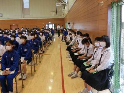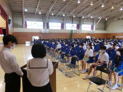 6月10日(金) 少年の主張校内大会 公開日 2022/06/10 更新日 2022/06/10 できごと 各学年の大会で選ばれた15名の代表による少年の主張校内大会が行われました。日常生活や社会の出来事をテーマに、自分が気になったこと、心を動かされたことをまとめた意見文を、豊かな表現力で発表していました。