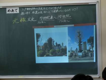 6月14日(火) 2年生社会科の授業 公開日 2022/06/14 更新日 2022/06/14 できごと 江戸時代・元禄文化の学習で、地元藤岡の偉人「和算の大家 関孝和」について学びました。中央公園にある石碑や胸像の写真には、口々に「見たことある!」という反応が。関孝和の作った「算額」は、今の時代の「謎解き」に近いものだということを知り、「その頃の藤岡には、和算による謎解きを楽しむ文化が町中に溢れていたんだね」という教師の言葉に、生徒たちは大きく頷いていました。