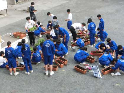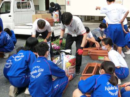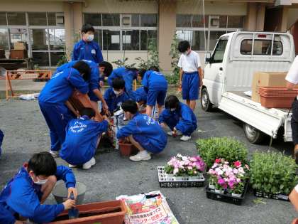 地域にある事業所「コメリ」さんから、花や土・プランターの寄付をいただきました。本日、専門委員会の時間に担当の方が来校し、園芸委員の生徒に植え方を指導してくださいました。たくさんの花のプランターで、生徒たちの目を楽しませてくれることでしょう。コメリのみなさま、ありがとうございました。