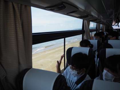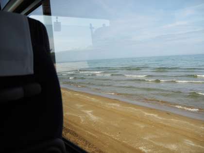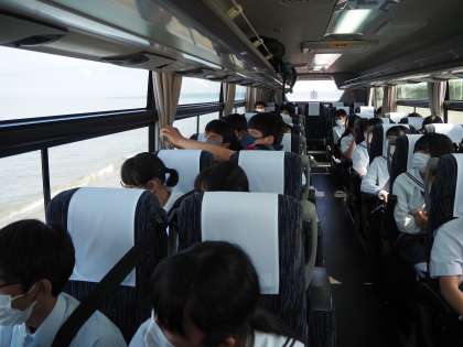 千里浜海岸をバスで走りました。波打ち際ぎりぎりを走るバスに車内は大いに盛り上がりました。