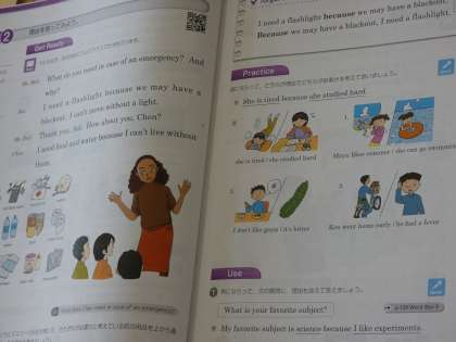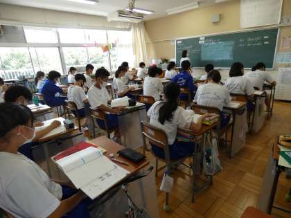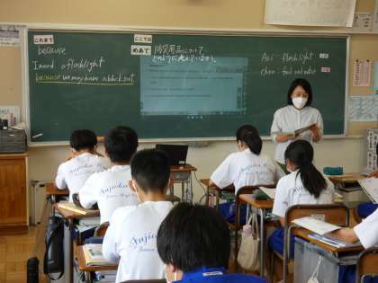 7月11日(月) 2年生英語の授業 公開日 2022/07/11 更新日 2022/07/11 できごと 2年生の英語では教科書にある「防災用品のことについて」の生徒と先生のやりとりを読み取っていました。先生の範読に続き、生徒はリズムよく英文を復唱していました。教室から元気な英語がたくさん聞こえてきました。