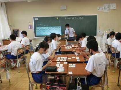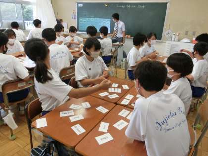 7月14日(木) 3年生英語の授業 公開日 2022/07/14 更新日 2022/07/14 できごと Warm upとして、今まで学習した単語を用いたカルタを行い、大いに盛り上がりました。(手で取る代わりにペンを使い、接触を避ける感染症対策をとっています。)