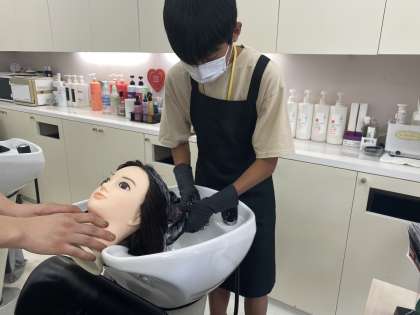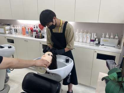 モッズヘアでは、マネキンを相手にシャンプーやドライヤーの練習をしていました。顔に水が飛ばないようにするなど、お客様をイメージして丁寧に仕事に取り組む姿が見られました。