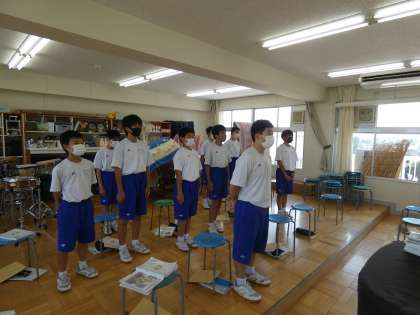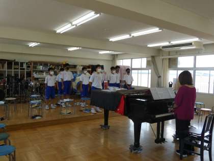 音楽室を覗くと、男子がパート練習をしていました。CDを流し、それに合わせて自分たちで歌い始めました。途中、音楽の先生がピアノで男性パートの音をとってくれました。