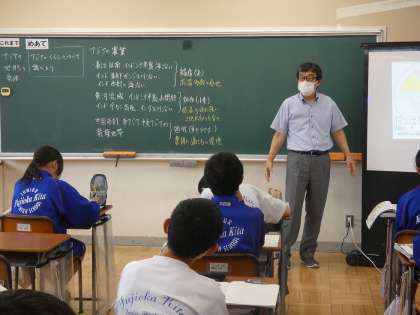 1年生の社会ではアジアの暮らしについて学習しました。4つの資料を比較し、そこからどんなことが分かるか、生徒の発言をもとに授業が進められました。