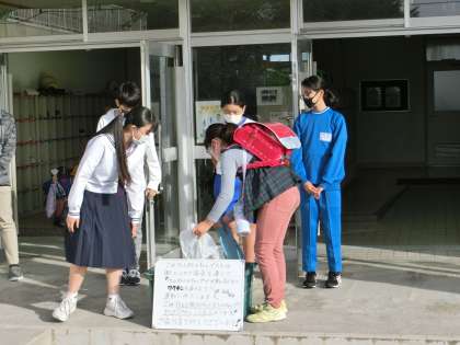 北中生徒会が神流小で朝のあいさつ運動を行いました。同時に、北斗祭に向けて力を入れているSDGsの取組の一つ「ペットボトルキャップの回収」を、神流小児童会のみなさんと合同で行いました。生徒会通信を見たり、児童会の皆さんの放送を聞いたりして、たくさんの児童の皆さんが協力をしてくれたおかげで、ゴミになるはずだったペットボトルキャップをワクチンに変えることができます。これからも北一貫校のつながりを生かした取組を行っていきます。