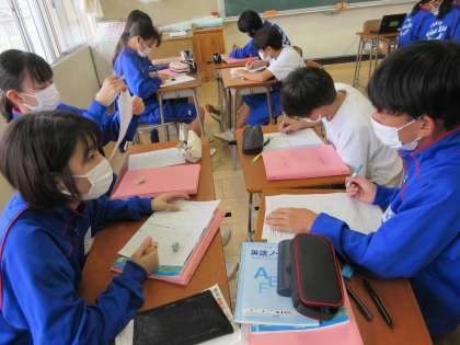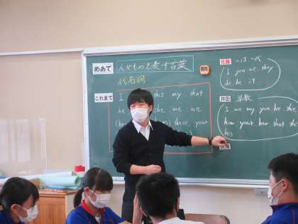 10月13日(木) 1年生英語の授業 公開日 2022/10/13 更新日 2022/10/13 できごと 「I you he she they……どんな分け方ができるかな?」 1年生の英語では、「代名詞」について学習しました。たくさんある「代名詞」を自分なりに分類し、どのように分けたか説明しました。繰り返し「代名詞」に触れることで自然と覚え、使えるようになることをねらいとしています。