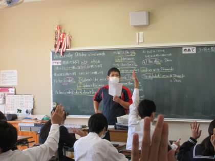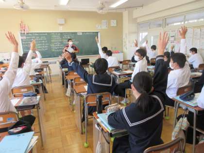 10月19日(水) 3年生英語の授業 公開日 2022/10/19 更新日 2022/10/19 できごと 「ハイ、ハイ、ハーイ!」 3年生の英語の授業では関係代名詞の復習をしていました。 生徒全員が挙手をし、who、which……指名された生徒は元気よく自分の考えを発表しました。