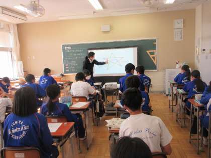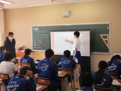11月2日(水) 2年生数学の授業 公開日 2022/11/02 更新日 2022/11/02 できごと 星形五角形の内角の和が180度であることを証明しよう。 2年生の数学では、星形五角形の中に隠れている図形に着目し、それをヒントに内角の和が180度になることを自分の言葉で友達に伝えました。その後、代表して、二人の生徒がみんなの前で発表しました。さすが2年生という堂々とした姿でした。