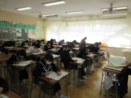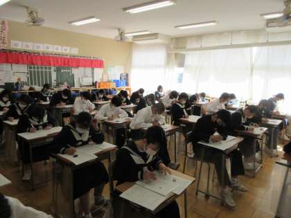 勝負の期末テスト2日目です。3年生は集中して問題を解いています。納得できる結果を出すことを祈っています。