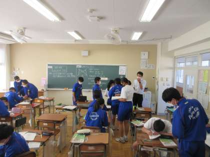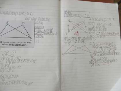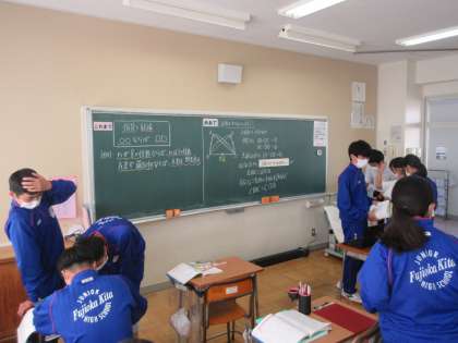 11月9日(水) 2年生数学の授業 公開日 2022/11/09 更新日 2022/11/09 できごと 三角形の合同の証明をできるようになろう。 2年生の数学ではこれまで学習した三角形の合同条件を使って練習問題に取り組みました。問題を解いたら先生のところへ行き、説明を行い、マルをもらったら次の問題に挑戦するスタイルで、次々と問題を解きました。生徒は意欲的に問題に挑戦し、時に仲間にアドバイスをしながら多くの問題を解くことができました。