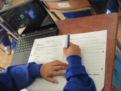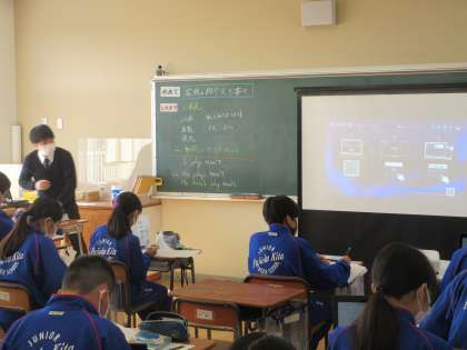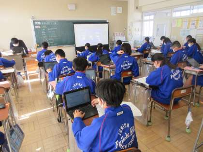11月11日(金) 1年生英語の授業 公開日 2022/11/11 更新日 2022/11/11 できごと 家族の紹介文を書こう。 1年生の英語の授業では、これまで学習してきた三単現の表現に気をつけ、家族の紹介文を書きました。辞書や検索サイトを活用しながら、家族の好きなスポーツや食べ物などについて紹介しました。完成したらご家族にも是非、読んでいただきたいと思います。