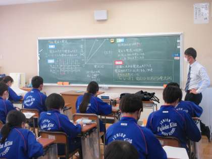 11月14日(月) 2年生理科の授業 公開日 2022/11/14 更新日 2022/11/14 できごと 電圧の大きさと電流の大きさにはどんな関係があるのか? 2年生の理科ではこれまで行った実験結果を基にオームの法則について学習しました。先生が、「小学校の時も同じような計算をしたけど覚えている?」と聞くと生徒は「み(道のり)は(速さ)じ(時間)!」とすぐに反応していました。小学校との学びのつながりが意識されていた授業でした。