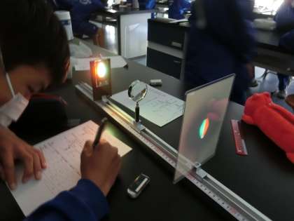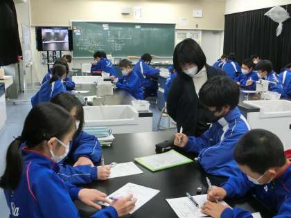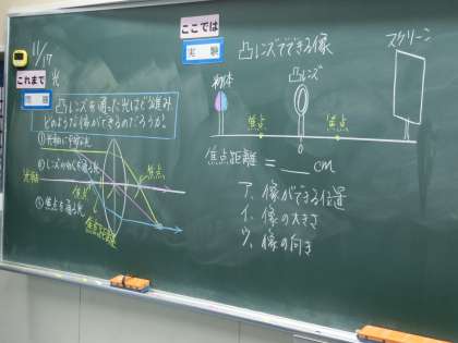 11月17日(木) 1年生理科の授業 公開日 2022/11/17 更新日 2022/11/17 できごと 「凸レンズを通った光はどう進み、どのような像ができるのだろうか」という問題に対し、実験を行い考察しました。焦点距離を変えたときの様子をワークシートに記録し、班の友達と確認し合いながら考えをまとめていました。