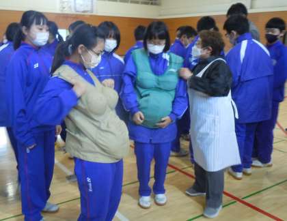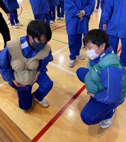 12月6日(火) 命の大切さ講座2 公開日 2022/12/06 更新日 2022/12/06 できごと 妊婦ジャケットを着て、妊婦の体験です。着せ合って、全員が体験しました。「重い。」「家事はできますか?」「できない。」など、お母さんの大変さを実感していました。 新生児の赤ちゃんを抱っこする体験では、みんな優しく抱っこようとする心遣いから、優しさが伝わってきました。