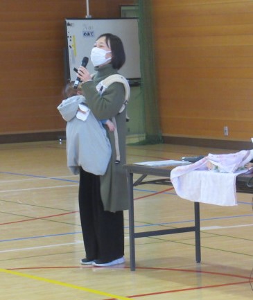 本校で育児休暇中の教諭が、6ヶ月の赤ちゃんと共に参加してくれました。出産時の感動、育児の大変さ、日々成長する我が子の可愛さ、そして中学生のみなさんを見て、これから成長する楽しみを語ってくださいました。