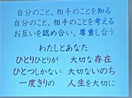 みなさんは、生まれる力、育つ力、生きる力を持っている。自分も大切、相手も大切、お互いを尊重、そして、命を大切に。