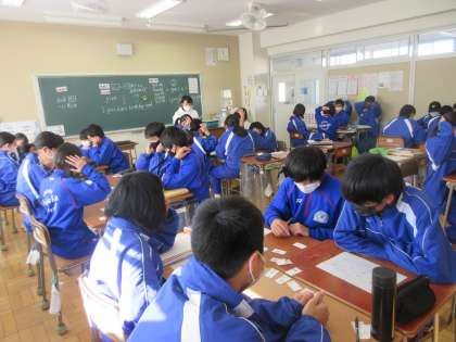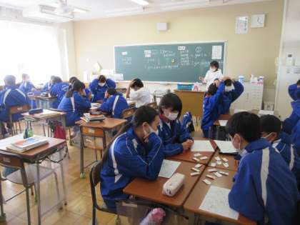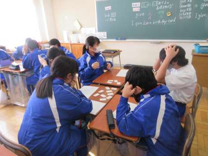 12月7日(水) 2年生英語の授業 公開日 2022/12/07 更新日 2022/12/07 できごと 「人に〜をあげるの表現を知ろう」 2年生の英語の授業では、「give 人 物」で「〜に〜をあげる」の表現を学習しました。その後、似た表現を使ったカルタを行いました。とっても盛り上がっていました。