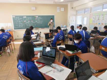 1年生の社会の授業では、これまで学習してきた貧困の原因や対策をヒントとして、アフリカ州を支援する視点を考えました。クロームブックの資料をもとに、個人で課題を見つけ、その解決方法を自分で考えた後、グループで話し合いました。