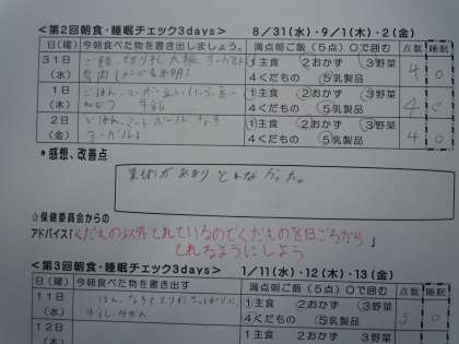 今日のチェックの様子では、果物をとって5点の人、おかずを意識して5点の人もいました。2学期「食べずに登校していた」人も、工夫・改善し、努力している様子がうかがえました。
