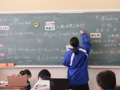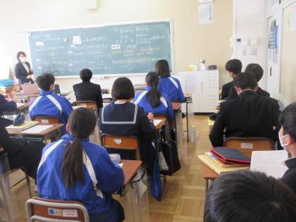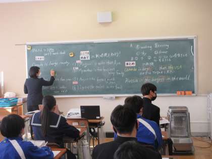 1月13日(金) 2年生英語の授業 公開日 2023/01/13 更新日 2023/01/13 できごと 「比較の表現を知ろう」 2年生の英語では、比較級や最上級について学習しました。 基本的な文型をしっかりとおさえ、練習問題に取り組みました。 複数の生徒が黒板に解答を書き、答え合わせをしながら定着につながるよう繰り返し大切なところを確認しました。