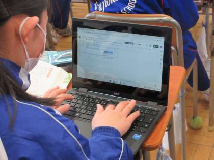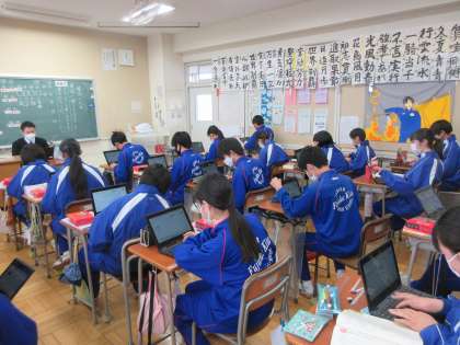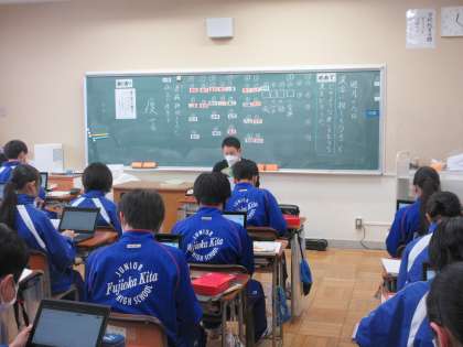 2年生の国語の授業では、教科書の「漢字に親しもう」の問題について解き、答え合わせをしました。多くの生徒のネームプレートが黒板に貼られ、自分の答えを発表することができました。最後に、クロームブックで振り返りを記入しました。