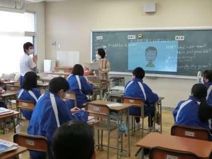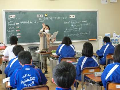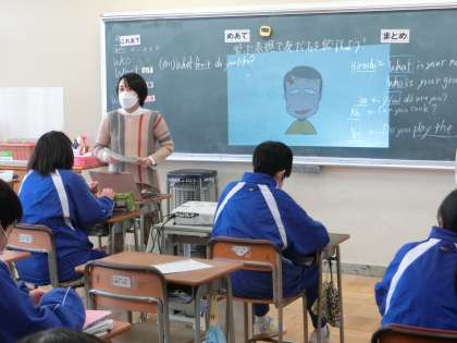 2月7日(火) 1年生英語の授業 公開日 2023/02/07 更新日 2023/02/07 できごと 「習った表現で友達を紹介しよう」をめあてに、Who,What,When,Where,Why,Which などを使った疑問文を考えました。授業の後半には各自が英文のクイズを作成し、次々に読み上げられるクイズに手を挙げて答えていました。