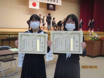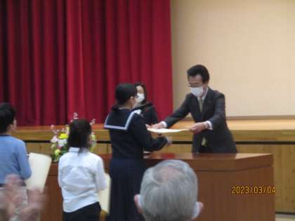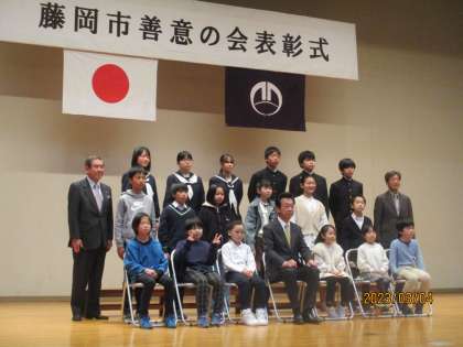 3月4日(土) 藤岡市善意の会表彰式 公開日 2023/03/06 更新日 2023/03/06 できごと 53回目となる藤岡市善意の会表彰式が藤岡市民ホールで行われました。 令和4年度の善行者と善意の会標語の入賞者の表彰がありました。最優秀作に3年生女子1名、優秀作に3年女子1名が選ばれ、市長さんから賞状をいただきました。おめでとうございます。 最優秀作 ちがうこと それはとってもすてきなこと 優秀作 目で見て聞いて考えて あなたの言葉が大切です