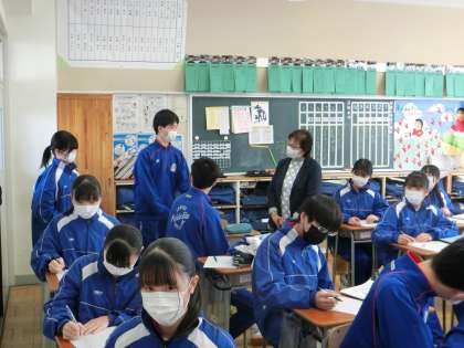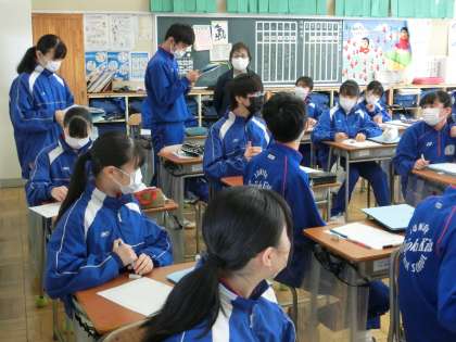 3月7日(火) 3年生英語の授業 公開日 2023/03/07 更新日 2023/03/07 できごと 2人組で英文のクイズ問題を出題し、周りの友達が答えを考える活動を行いました。出題者は振り返りの感想も英語でALTに伝えていました。