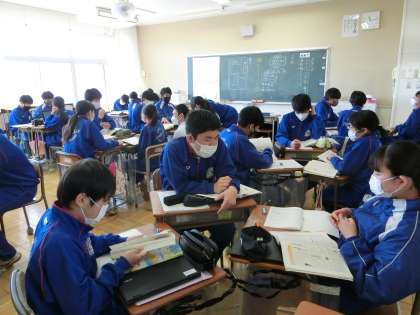 3月7日(火) 2年生国語の授業 公開日 2023/03/07 更新日 2023/03/07 できごと 壁新聞を作るに当たり、内容や構成をグループで検討しました。抽象的な思考を少しずつ具体化するための手順を知り、友達と意見を交換しながら考えを広げていました。