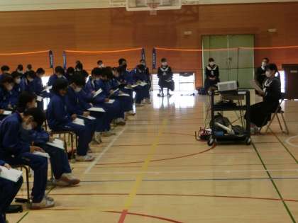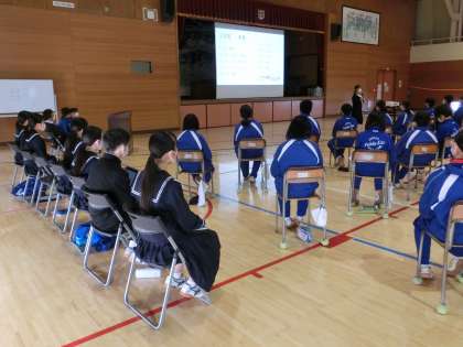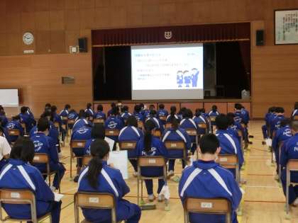 2年生の代表者がチャレンジウィークについて1年生に発表しました。自分自身の体験をもとに、わかりやすく説明する2年生の話を、メモを取りながら真剣に聞く1年生の姿が印象的でした。
