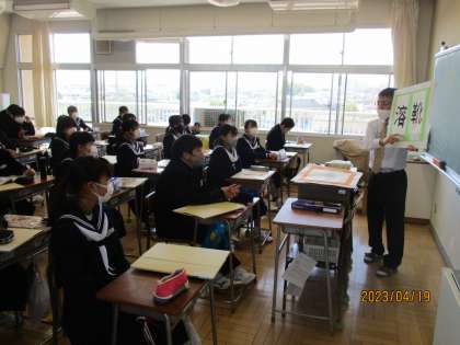 4月19日(水) 1年生美術の授業 公開日 2023/04/19 更新日 2023/04/19 できごと 4月19日(水)1校時。1年生初めての美術の授業の様子です。 まずは、自己紹介からスタート。 さて、中学校の美術ではどんなことを学習するのでしょう? 担当の先生から、「鉛筆の使い方からはじめるよ。」と伝えられると、驚いた表情を示しながらも、具体的に「自分の手をかく」ことなど、これからの学習の内容を教わると興味深そうに話を聞いていました。