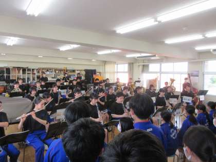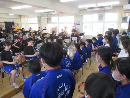 4月20日(木) 吹奏楽部ミニコンサート 公開日 2023/04/20 更新日 2023/04/20 できごと 本日16:15より音楽室にて新入生を歓迎する吹奏楽部のミニコンサートが開催されました。「ミックスナッツ」や「マツケンサンバ」などリズミカルな合奏を披露し、1年生もタンバリン片手に体を揺らしながら楽しんでいました。 26日(水)に部活動集会が行われ、いよいよ入部となります。1年生には、それまでにたくさんの部活動を見学・参加し3年間続けられる部活を選んでほしいと思います。