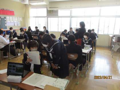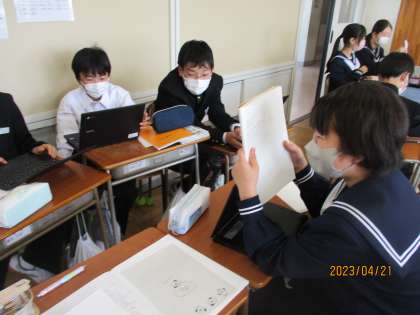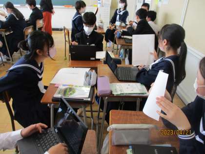 4月21日(金) 1年生理科の授業 公開日 2023/04/21 更新日 2023/04/21 できごと 1年生理科の授業の様子です。 実際に観察をし、スケッチしてきた物をもとに、青の花の特徴を調べてまとめ、グループで発表しました。