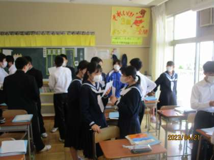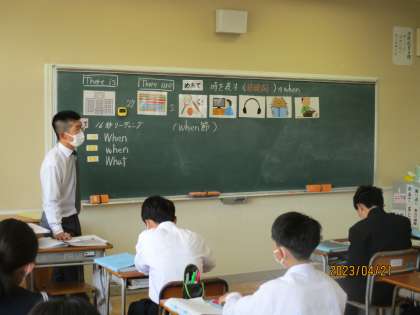 4月21日(金) 2年生英語の授業 公開日 2023/04/21 更新日 2023/04/21 できごと 2年生英語の授業の様子です。 時をあらわす接続詞(When)を使って、自分の選んだ文例を使って、ゲーム形式で友達とコミュニケーション活動をおこなっていました。とっても楽しそうに話す姿が印象的でした。