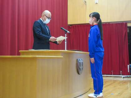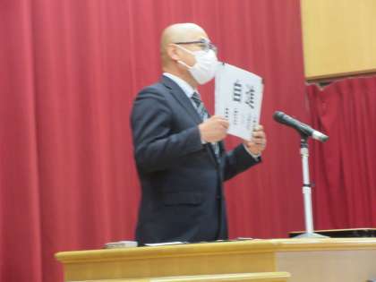 校長先生から生徒会スローガンである「自進(自信×進歩)」と教職員のスローガンである「エバーオンワード〜限りない前進〜」の紹介があり、目標に向けチャレンジし、失敗したら話し合いまたチャレンジしていく中に成長があるとのお話がありました。また、ケータイ、スマホの使い方について再度考えてほしいこと、「なりすまし」等の事件に注意することなどのお話がありました。