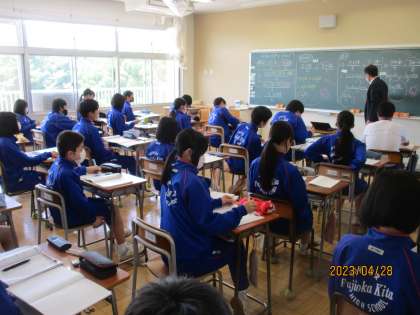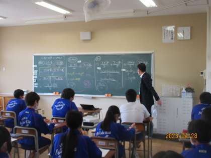 4月28日(金) 2年生数学の授業 公開日 2023/04/28 更新日 2023/04/28 できごと 2年生数学の授業の様子です。 「分配法則はどのようにやったらよいのだろう?」 今日は多項式の分数計算です。 分数が苦手な人にとっては、さらに難しい問題になってきました。 分数と分配法則とそれをれを復習しながら、よく思い出して考えました。