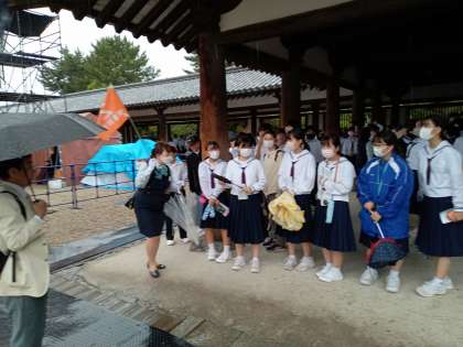 雨の中ですが、ガイドさんの話をしっかり聞きながら鑑賞しています。