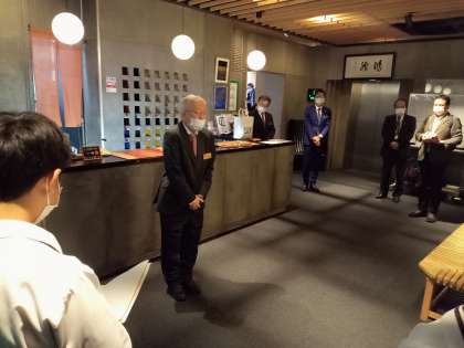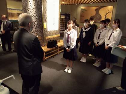 予定通り、旅館に到着。実行委員による入館式を行いました。実行委員に代表者があいさつし、旅館こうろの方からお話をいただきました。